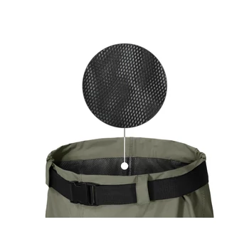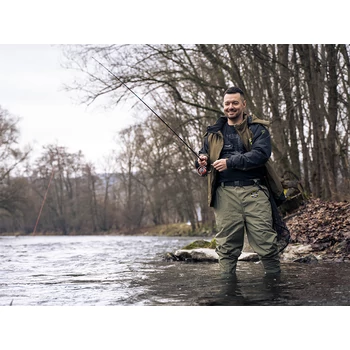 A Delphin HRON Pants gázlónadrág kiváló megoldást kínál sekély vízben történõ gázoláshoz, ahol nincs szükség mellig érõ gázlócsizmára. Csónakban is kiválóan használható. Praktikusságának és természetes dizájnjának köszönhetõen minden horgásztechnikához alkalmas. Ez a nadrág rendkívül könnyû és jól átgondolt szabással rendelkezik, így biztosítja a szabad mozgást és a kényelmes viseletet. Természetesen teljesen vízálló és rendkívül tartós. A levehetõ öv lehetõvé teszi a derékrésznek a horgász testéhez való igazítását. A strapabíró és erõs talpú csizma kiváló stabilitást biztosít még nehéz körülmények között is. A sarokrészen található kiemelkedések megkönnyítik a csizma levételét. Anyagösszetétel: Taslon / PVC |