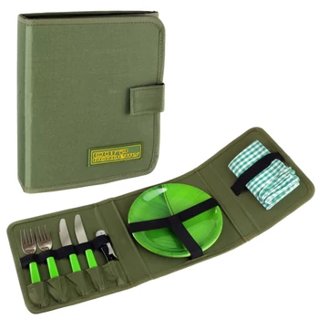 A kemény hordtáska tartalmaz két konyharuhát, két darab nagyon strapabíró műanyagból készült tányért, komplett evőeszközöket és nyitószerszámot.